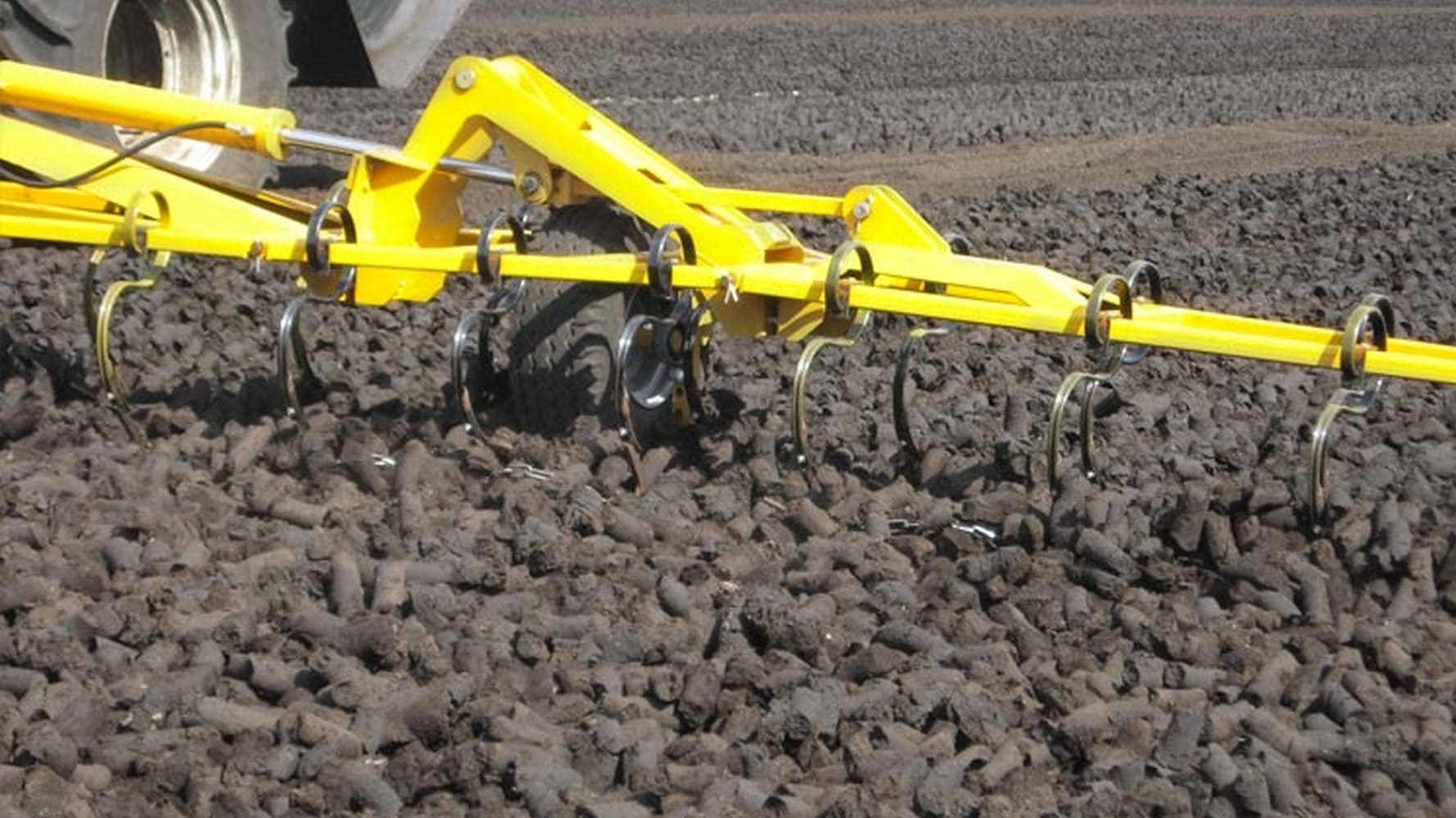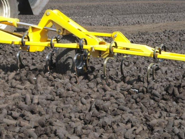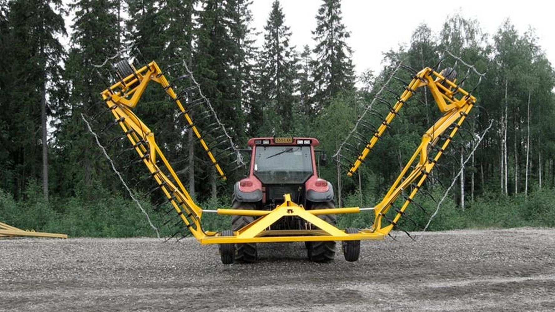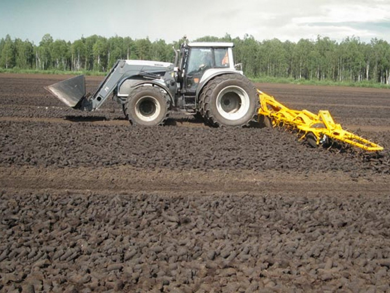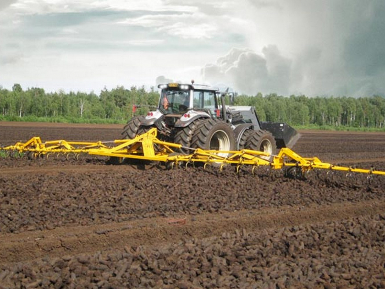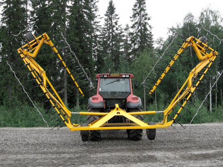 Между ее зубьями натянуты цепи, которые проскальзывают по почве под кусковым торфом, поэтому ворошилка надежно переворачивает кусковой торф отрывая его от поверхности, и куски высушивается гораздо быстрее.
